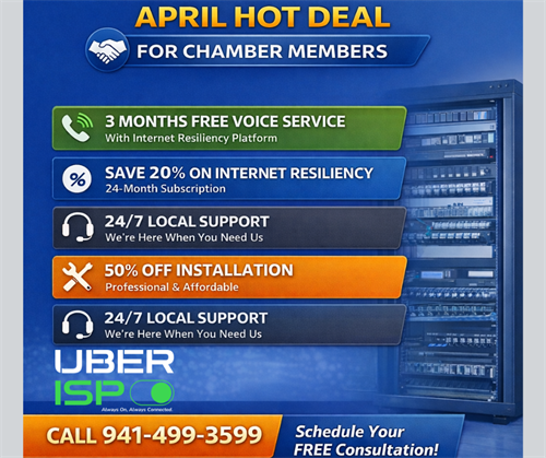 Finish April with confidence by upgrading to reliable, resilient business internet built specifically for Southwest Florida businesses. UBER ISP helps fellow Chamber members reduce downtime, improve performance, and stay connected when it matters most.